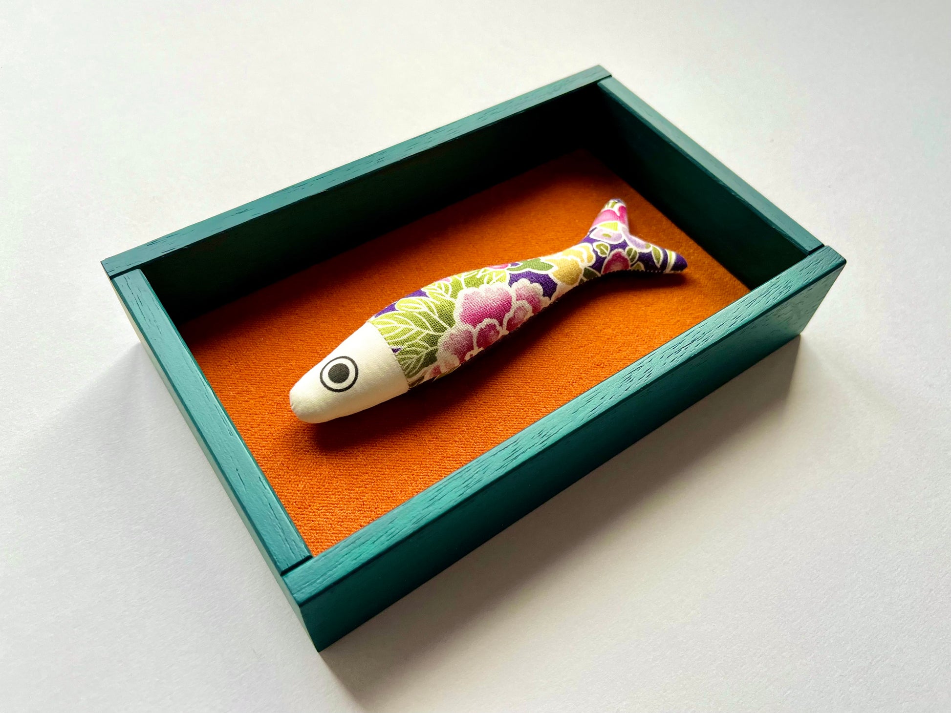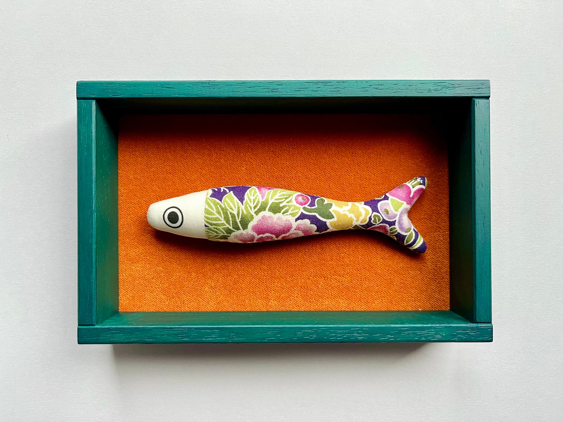 FISHBOX è una decorazione da parete o da appoggio interamente realizzata a mano. La cornice, in legno tinto verde ftalo con colori ad acqua atossici, misura 19,5 cm (base) x 12,5 cm (altezza) x 4 cm (profondità). Sullo sfondo, rivestito in velluto giallo zafferano, è fissato un pesce confezionato con tessuto floreale giapponese. Il pesce misura 15 cm (lunghezza), 3 cm (larghezza pancia) / 4 cm (larghezza coda) ed ha imbottitura in ovatta.